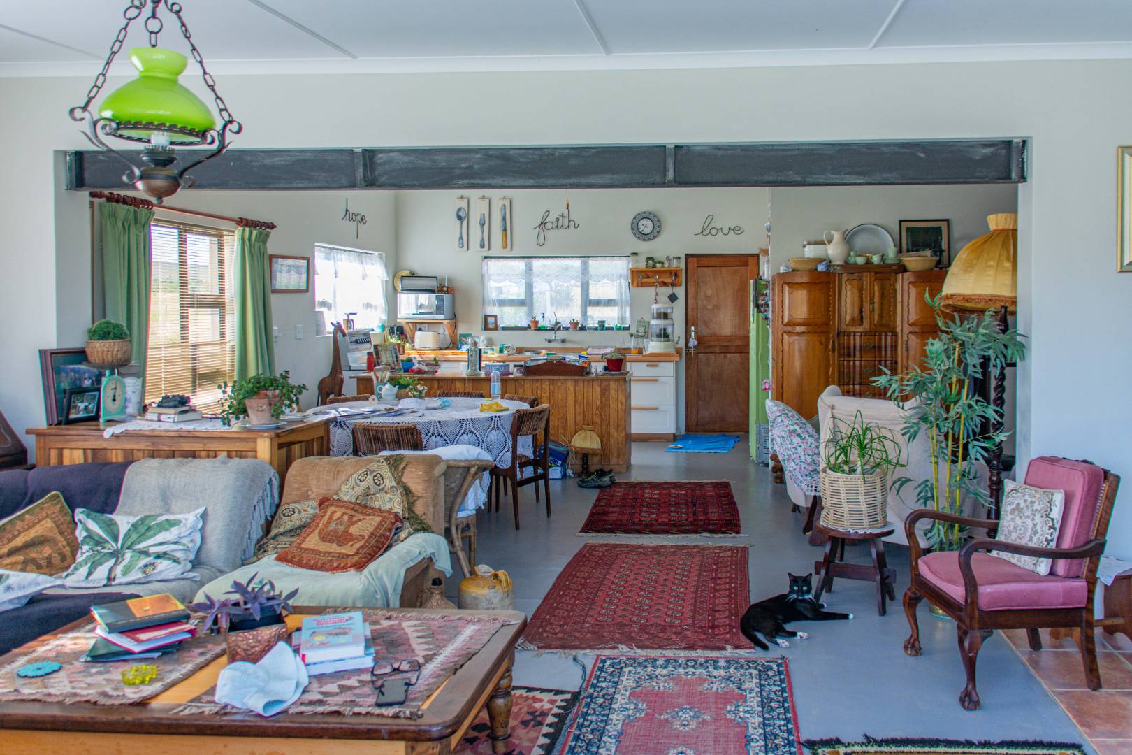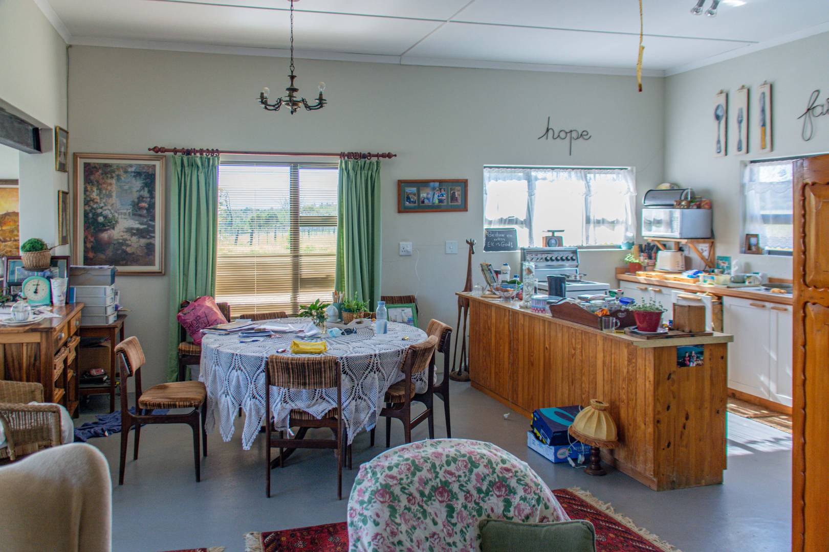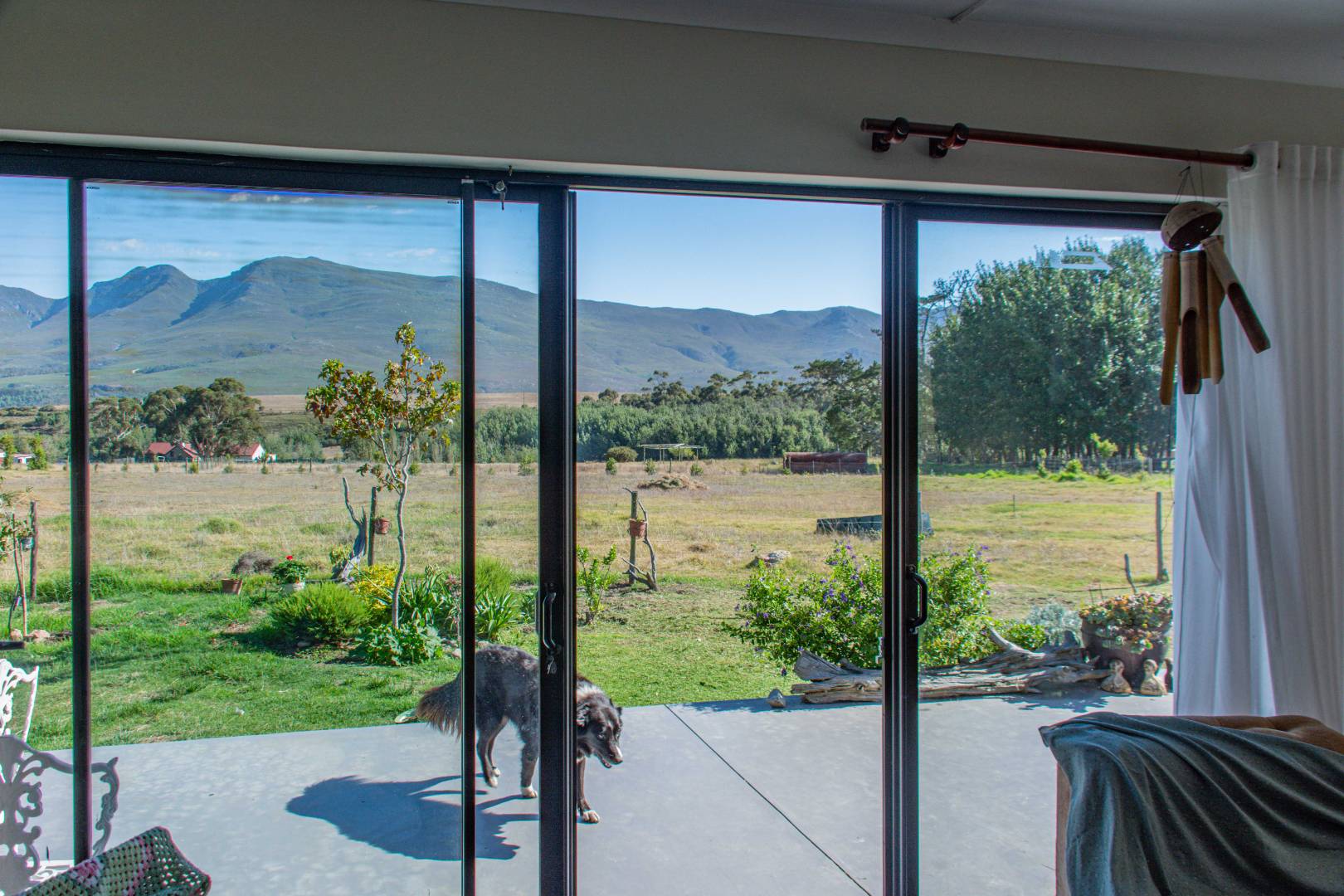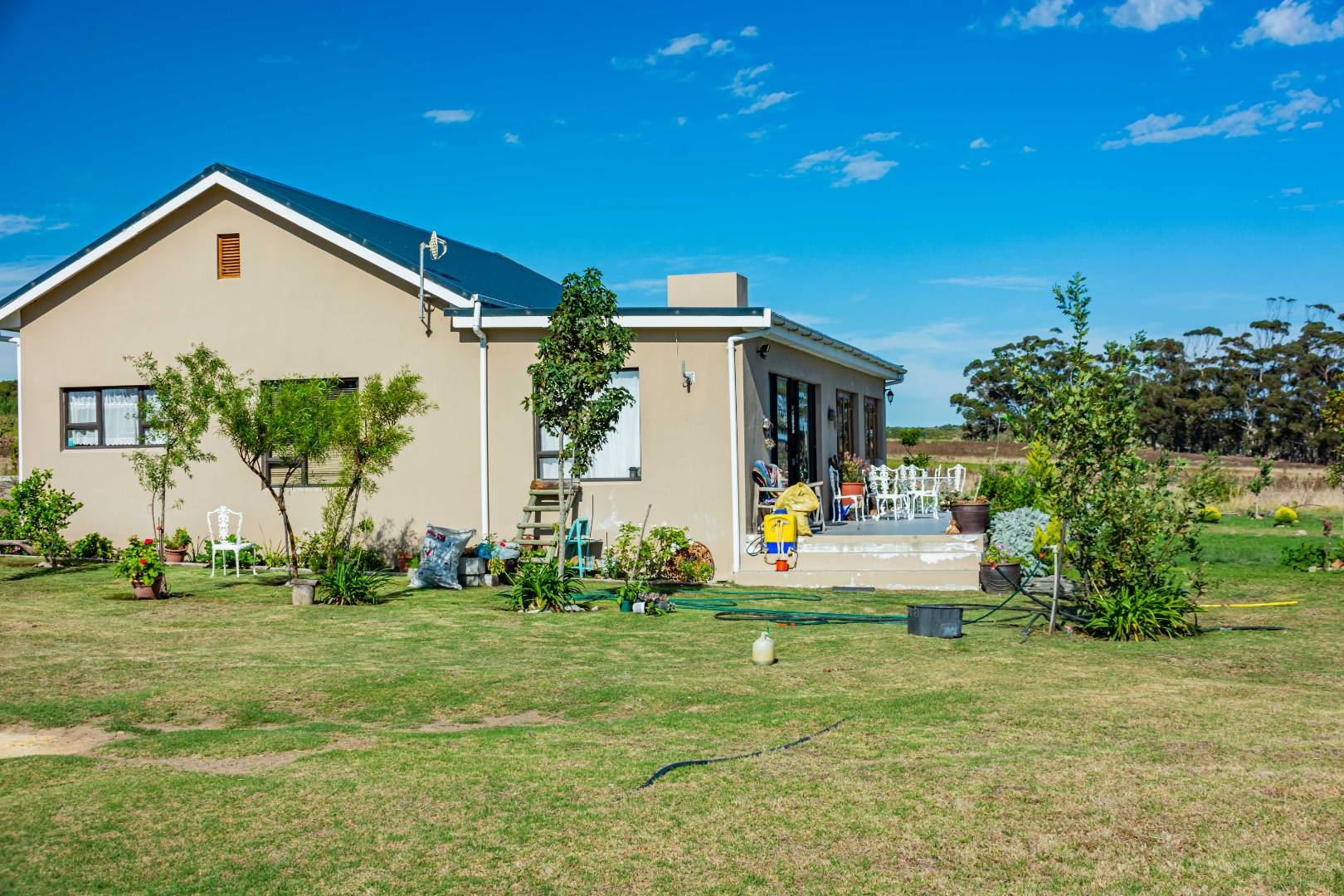 A new, modern farmhouse with 3 bedrooms, 2 bathrooms, an open-plan living and dining area, indoor braai area, and a large patio offering stunning views.