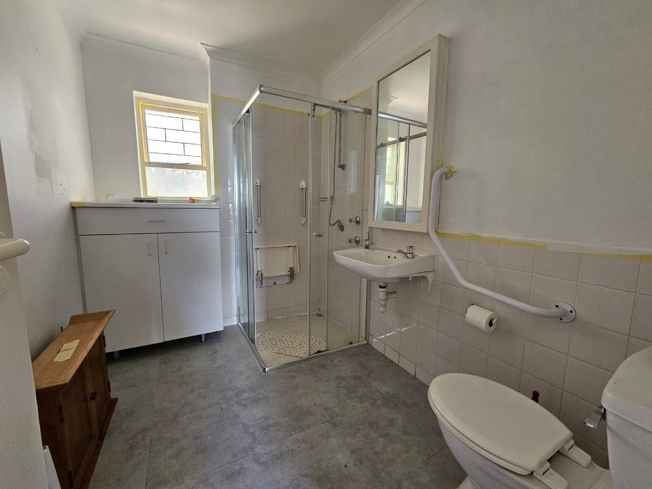 The bathroom is equipped with additional cupboards, providing ample storage, and includes safety features such as handles and a seating area in the shower for enhanced accessibility and comfort.